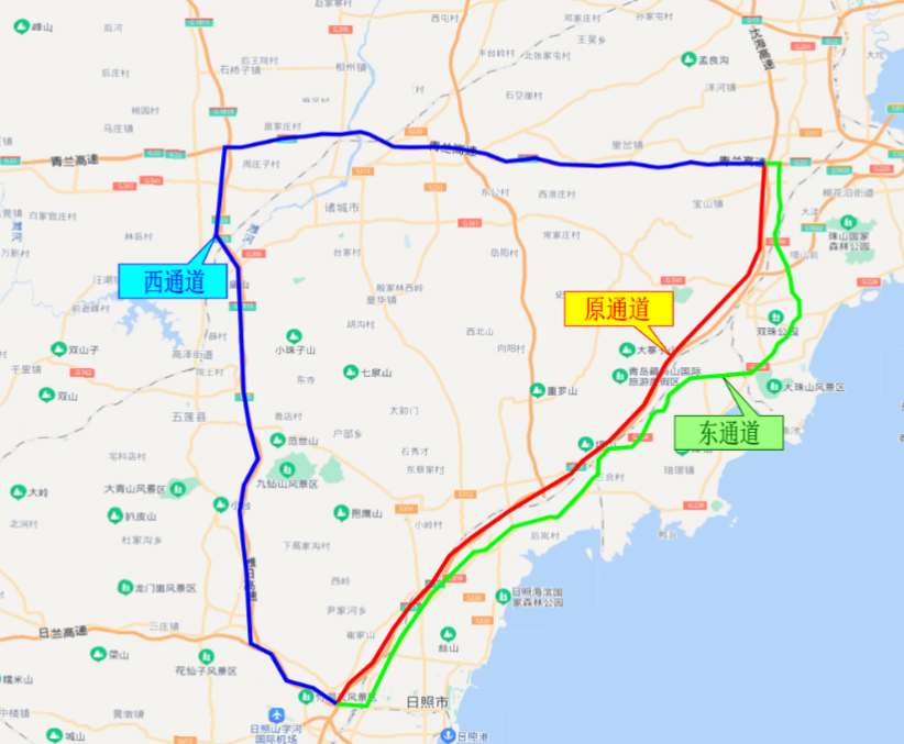 利用日兰高速、潍日高速、青兰高速、G204国道作为日照至青岛的分流路径。