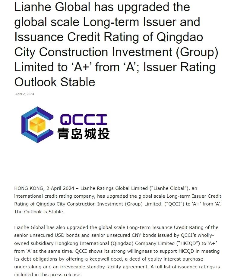 4月2日,权威评级机构联合国际正式宣布上调青岛城投集团国际长期发行人评级从‘A’上调至‘A+’,展望稳定,同时将由青岛城投全资子公司香港国际(青岛)有限公司(“香港国际”)发行的高级无抵押美元债券和高级无抵押人民币债券的国际长期发行债务评级从‘A’上调至‘A+’。