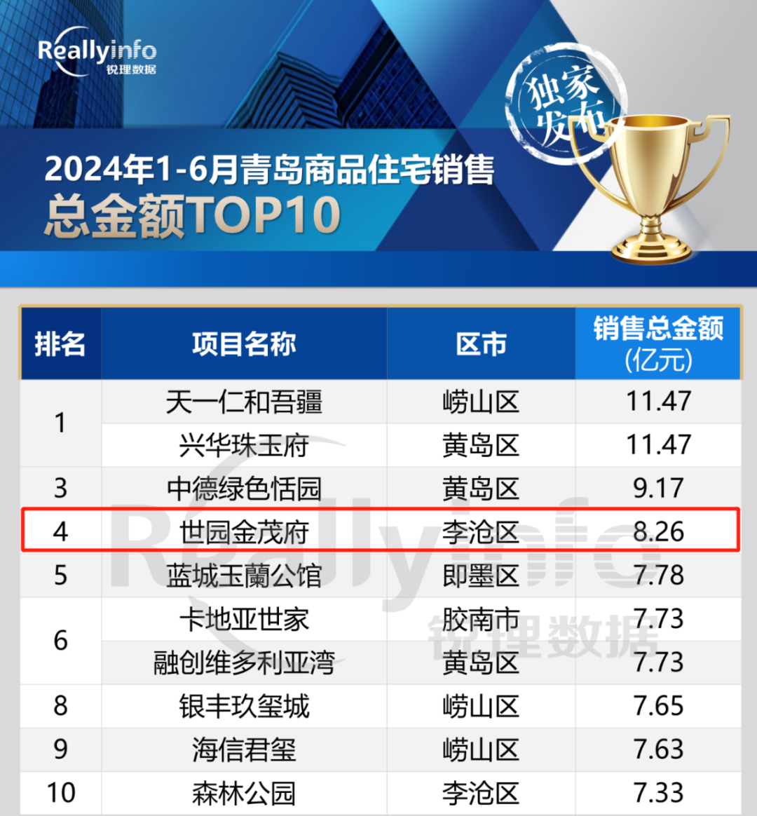 近日,锐理数据发布“青岛房市年中榜”,青岛城投集团世园·金茂府以8.26亿销售总金额荣登青岛市2024上半年网签金额第四名,稳居李沧区第一名。
