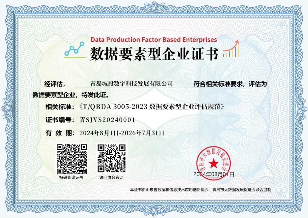 青岛城投数科公司顺利获评青岛市“数据要素型企业”