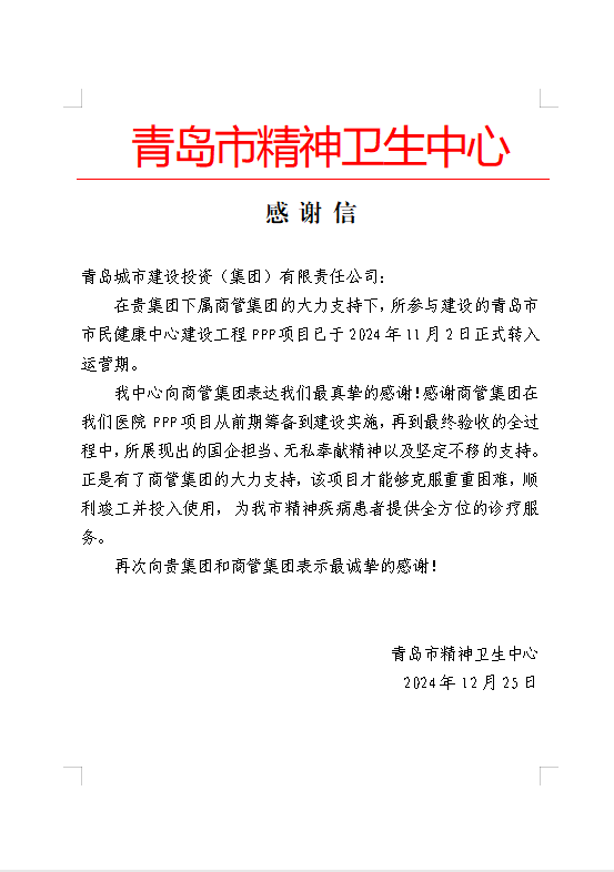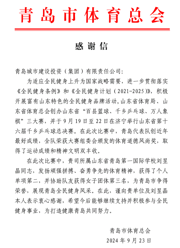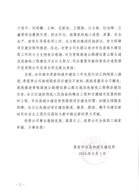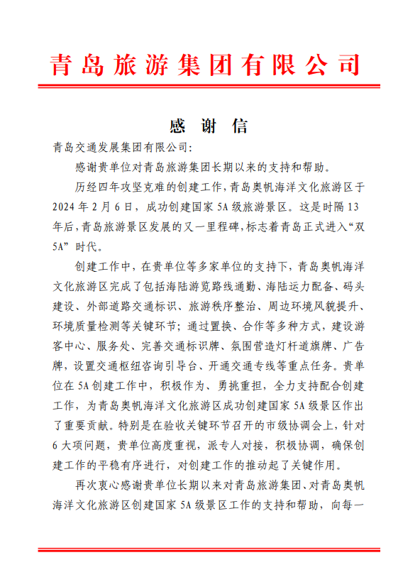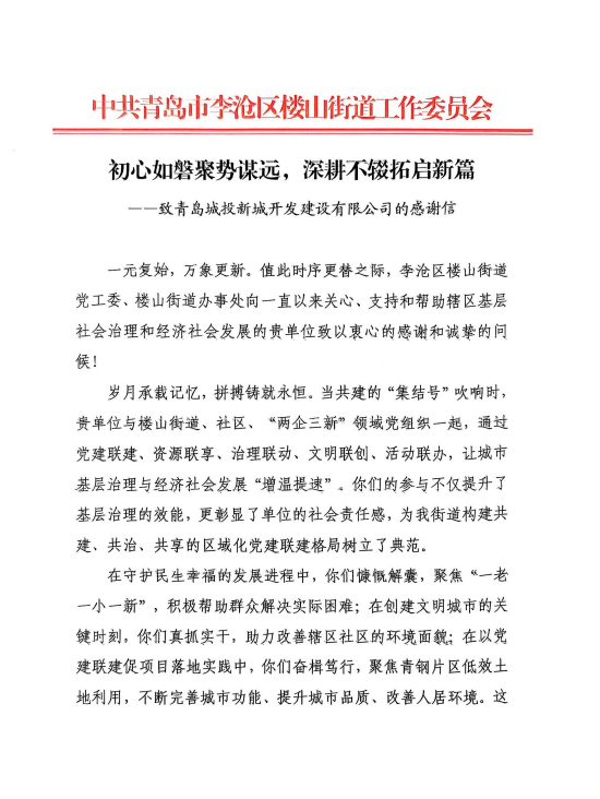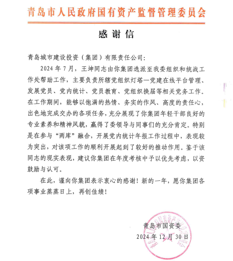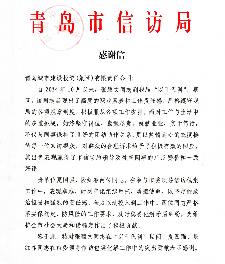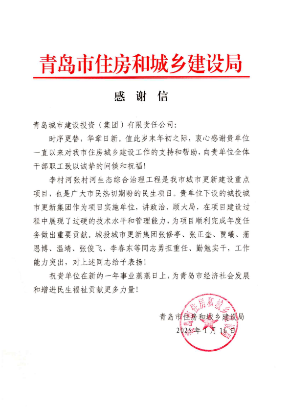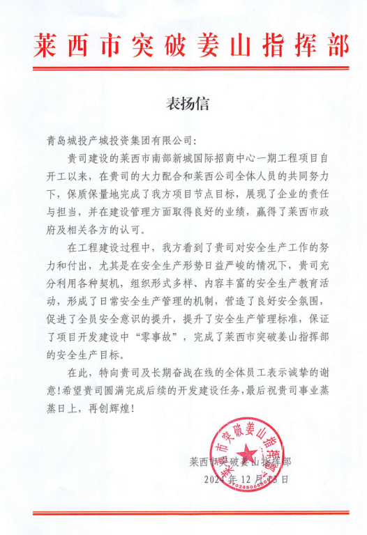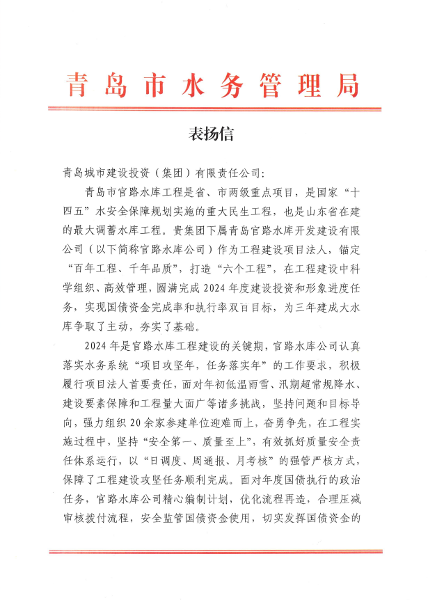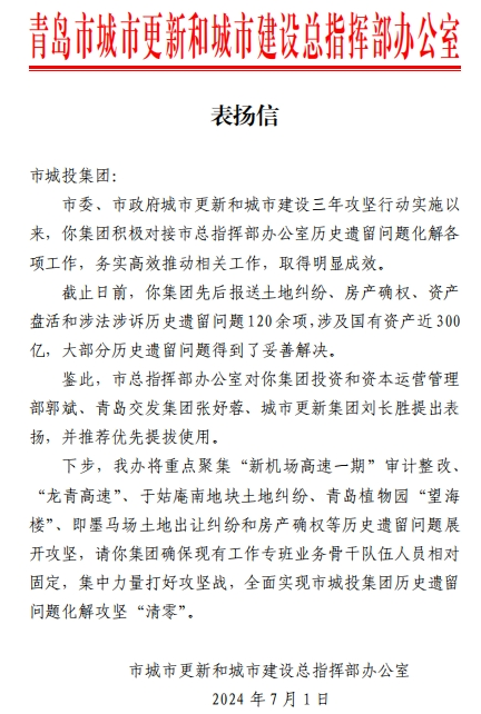 在过去的2024年,青岛城投集团全体干部员工全面贯彻落实党的二十届二中、三中全会精神,认真贯彻落实集团党委决策部署,以勇争上游的雄心壮志,“打头阵、当先锋”的进取意识,出色完成各项工作任务,涌现出了一批表现优异、成绩突出的集体和个人,收获了131项集体荣誉、67项个人荣誉,以及来自多个单位的26封感谢信。社会各界的认可与感谢,就是城投集团继续奋进前行的不竭动力!以下为2024年度部分荣誉和感谢信集锦: