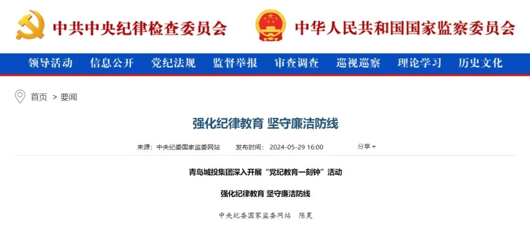 近日,《强化纪律教育 坚守廉洁防线 青岛城投集团深入开展“党纪教育一刻钟”活动》相关专题报道在中央纪委国家监委网站首页要闻栏目发表,青岛城投集团基层党组织深入开展党纪学习教育的亮点做法再次获得上级部门“点赞”。