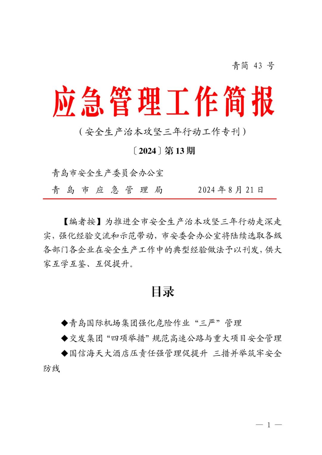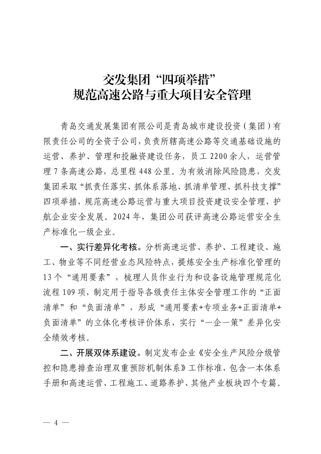 为深入推进国家、省市和青岛城投集团安全生产治本攻坚三年行动及工作要求,健全完善安全管理体系建设,夯实安全管理基础,实现高速公路运营与投资建设安全重大事故隐患动态清零,青岛城投集团旗下交发集团立足实际,制定施行“抓责任落实、抓体系落地、抓清单管理、抓科技支撑”四项举措,优秀经验做法被市安委办《应急管理工作简报》(安全生产治本攻坚三年行动专刊)第13期刊发推广。