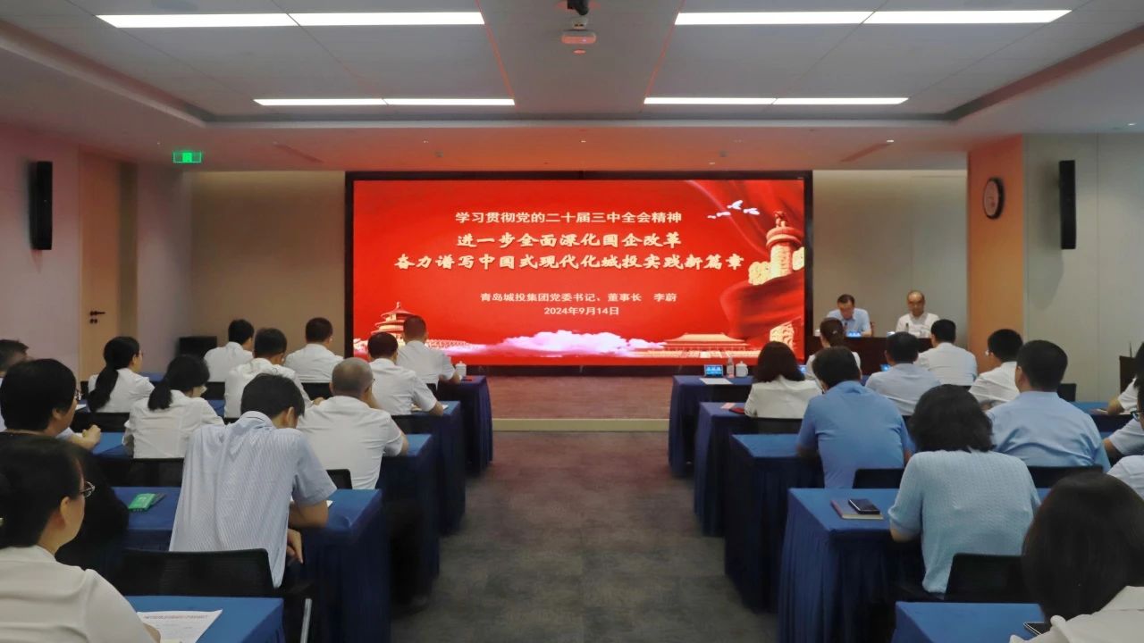 为全面深入学习领会党的二十届三中全会精神,扎实推进学习宣传贯彻工作,9月14日,青岛城投集团举办党的二十届三中全会精神宣讲报告会。本次宣讲会通过分设会场、视频直播方式进行。集团党委书记、董事长李蔚作宣讲报告,集团党委副书记、总经理于延涛主持会议,集团党委班子成员、干部职工代表102人在主会场学习,约1200名党员干部职工在分会场收看。(图为宣讲报告会现场)李蔚以“进一步全面深化国企改革 奋力谱写中国式现代化